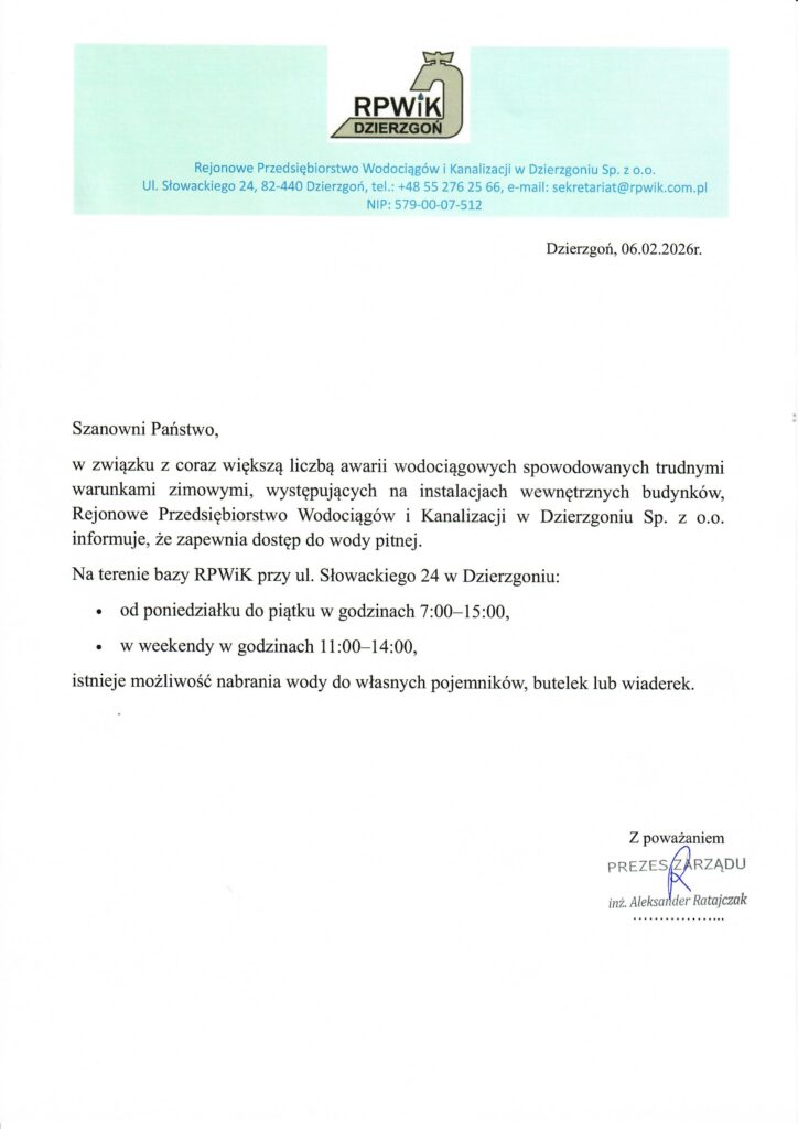 Komunikat RPWIK Dzierzgoń – 06.02.2026